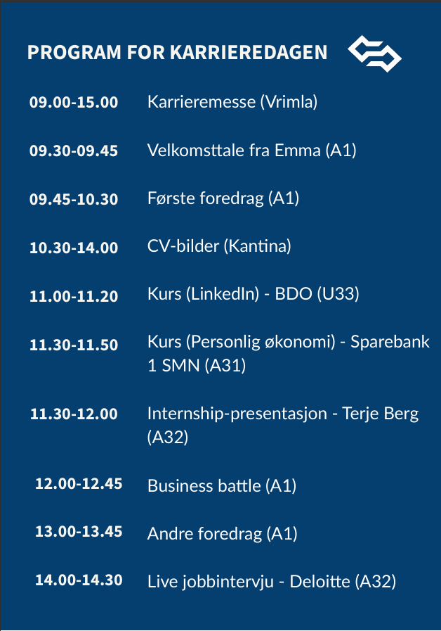 Karrieredagen består av utallige møter mellom deg som student og representanter fra næringslivet! Bedrifter og organisasjoner vil ha stands i Vrimla med aktiviteter og informasjon. I tillegg får vi besøk av kjente foredragsholdere og det avholdes masterpresentasjoner. Det blir selvfølgelig goodiebags, kaffe og fantastiske muligheter for nettverksbygging!